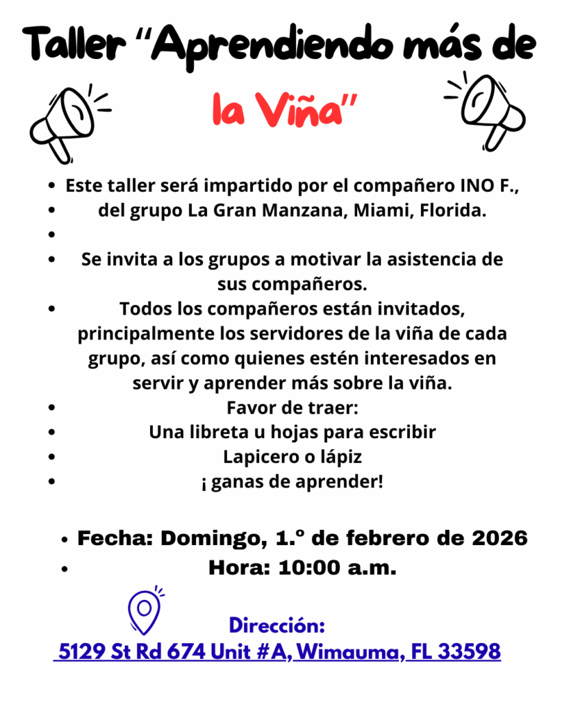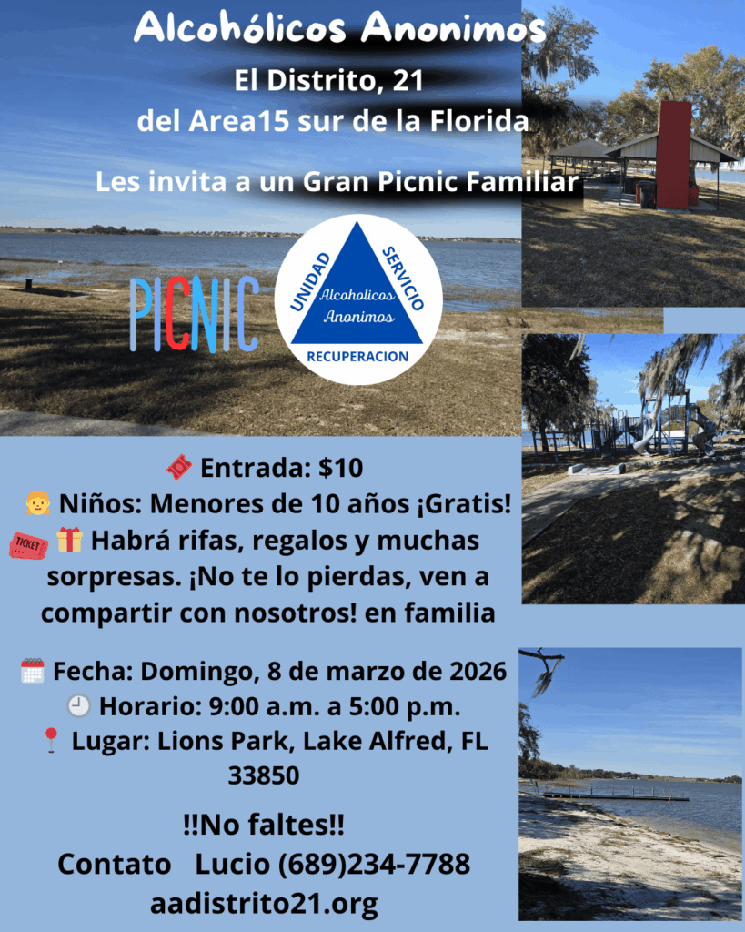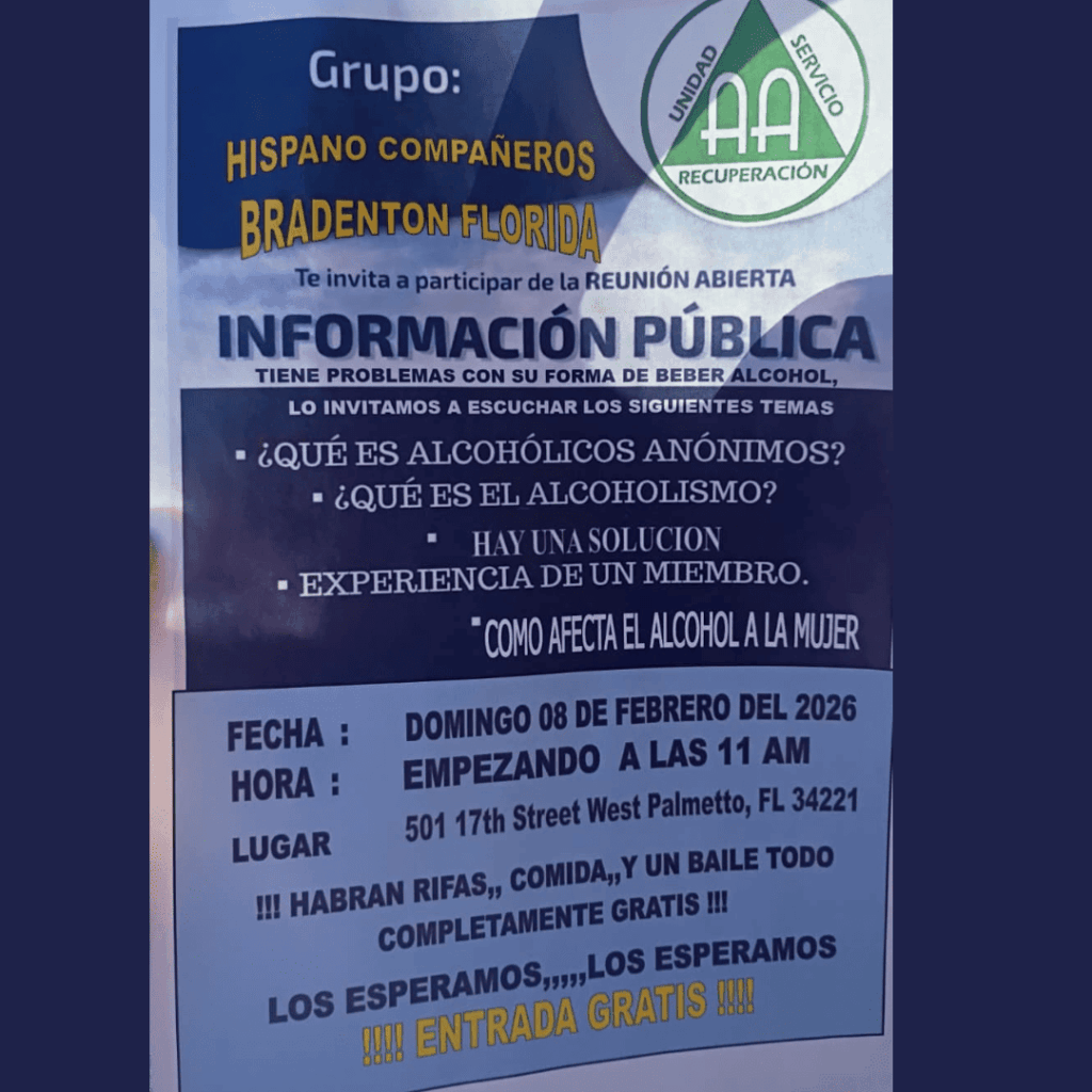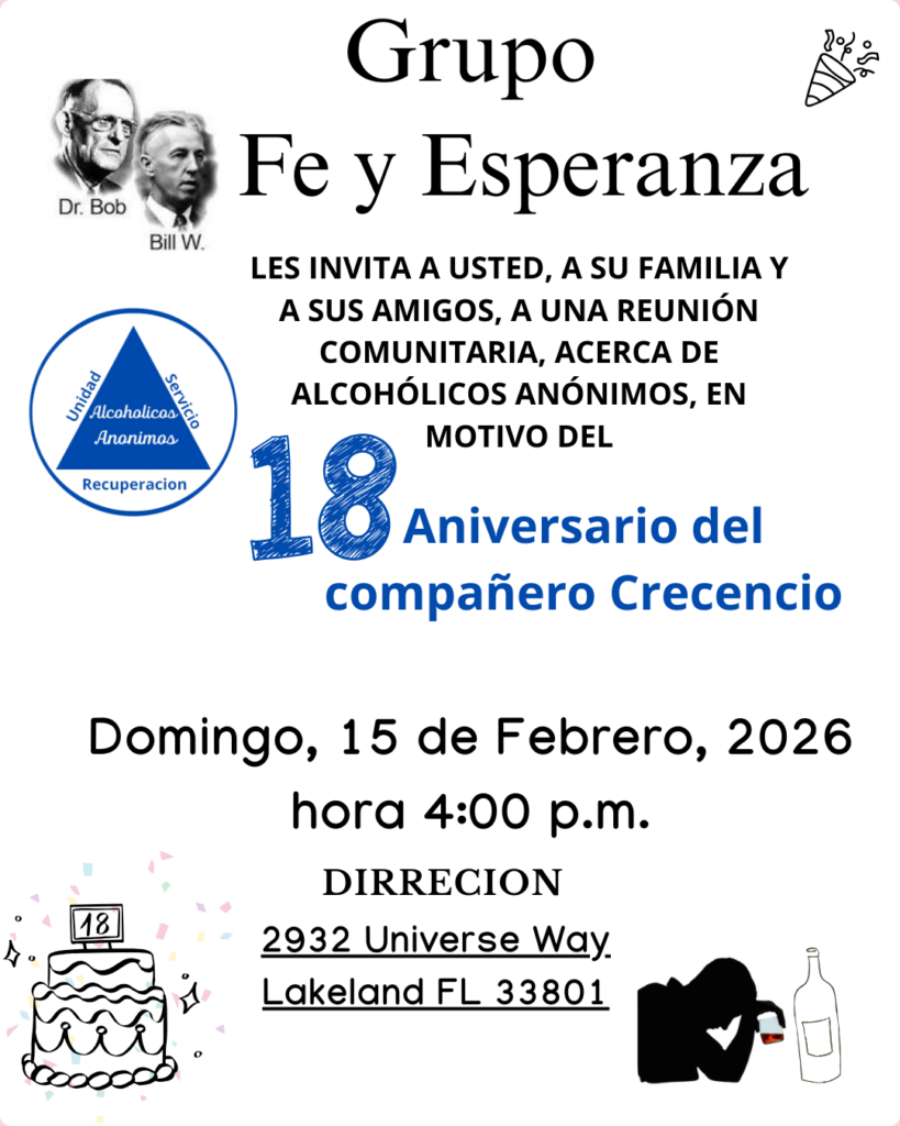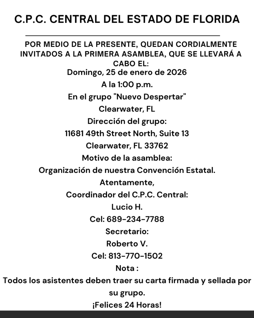 CALENDARIO DE TALLER DE PASOS 2026Enero 18 — Introducción / Primer pasoEnero 25 — Primer pasoFebrero 1 — Segundo pasoFebrero 15 — Tercer pasoFebrero 22 — Tercer pasoMarzo 1 — Cuarto pasoMarzo 8 — Cuarto pasoMarzo 22 — Cuarto pasoMarzo 29 — Cuarto pasoAbril 12 — Quinto pasoAbril 19 — Sexto pasoAbril 26 — Séptimo pasoMayo 3 — Octavo pasoMayo 17 — Noveno pasoMayo 24 — Décimo pasoMayo 31 — Undécimo pasoJunio 7 — Duodécimo paso⸻Ubicación:Grupo Camino a la Libertad122 N 11th StHaines City, FL 33844Horario:12:30 p.m. a 2:30 p.m.Nota:Pueden asistir todas las personas que lo deseen, no importa de qué grupo sean. CIERRE CON NUESTRA REUNIÓN PÚBLICA: CENA Y BAILE Sábado 21 de marzo | A partir de las 4:00 PM 5501 62nd Ave N, Pinellas Park, FL 33781
