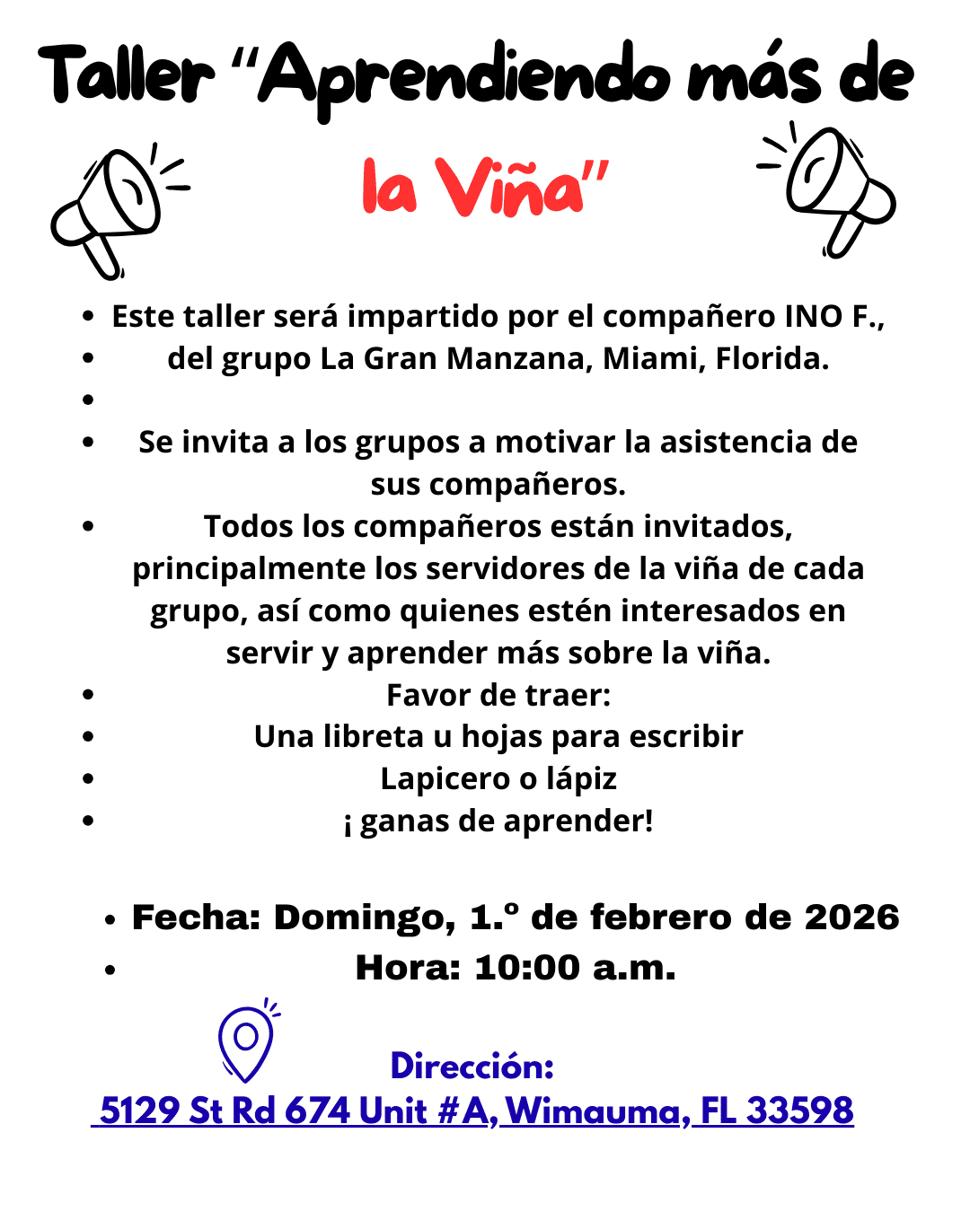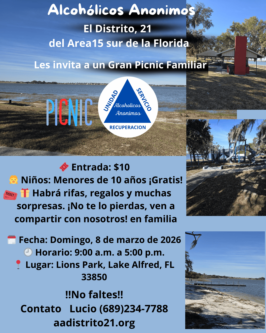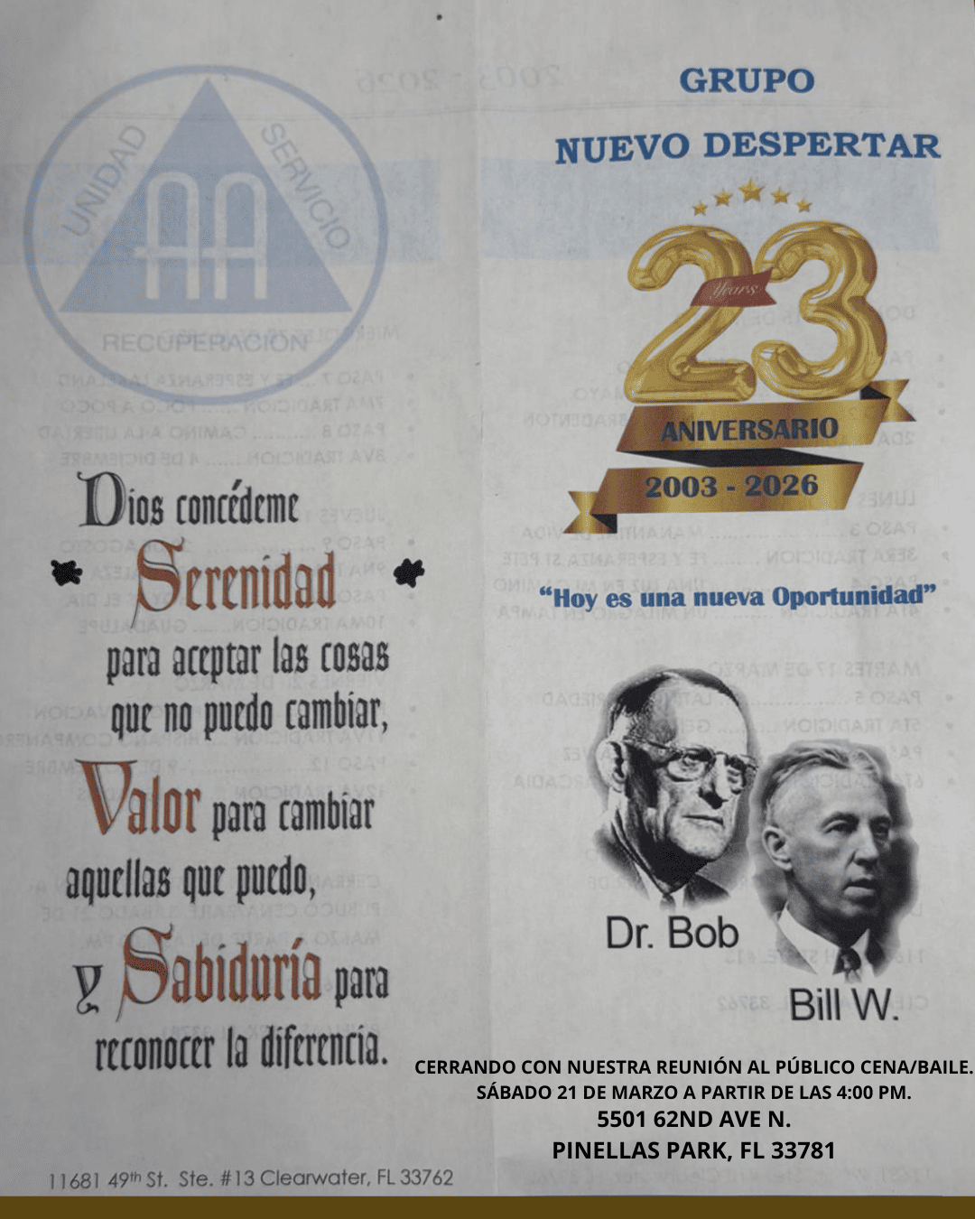 CALENDARIO DE TALLER DE PASOS 2026Enero 18 — Introducción / Primer pasoEnero 25 — Primer pasoFebrero 1 — Segundo pasoFebrero 15 — Tercer pasoFebrero 22 — Tercer pasoMarzo 1 — Cuarto pasoMarzo 8 — Cuarto pasoMarzo 22 — Cuarto pasoMarzo 29 — Cuarto pasoAbril 12 — Quinto pasoAbril 19 — Sexto pasoAbril 26 — Séptimo pasoMayo 3 — Octavo pasoMayo 17 — Noveno pasoMayo 24 — Décimo pasoMayo 31 — Undécimo pasoJunio 7 — Duodécimo paso⸻Ubicación:Grupo Camino a la Libertad122 N 11th StHaines City, FL 33844Horario:12:30 p.m. a 2:30 p.m.Nota:Pueden asistir todas las personas que lo deseen, no importa de qué grupo sean. CIERRE CON NUESTRA REUNIÓN PÚBLICA: CENA Y BAILE Sábado 21 de marzo | A partir de las 4:00 PM 5501 62nd Ave N, Pinellas Park, FL 33781